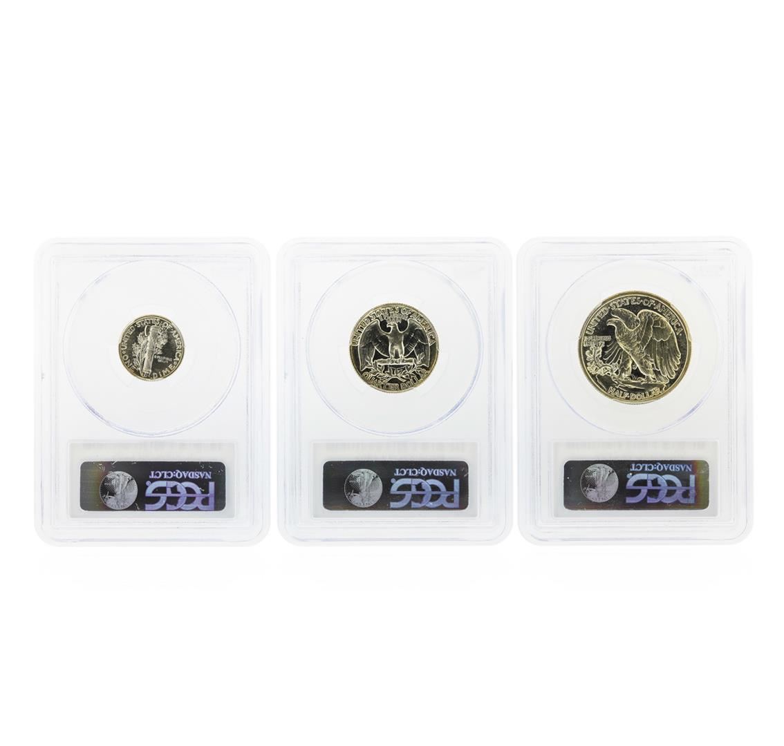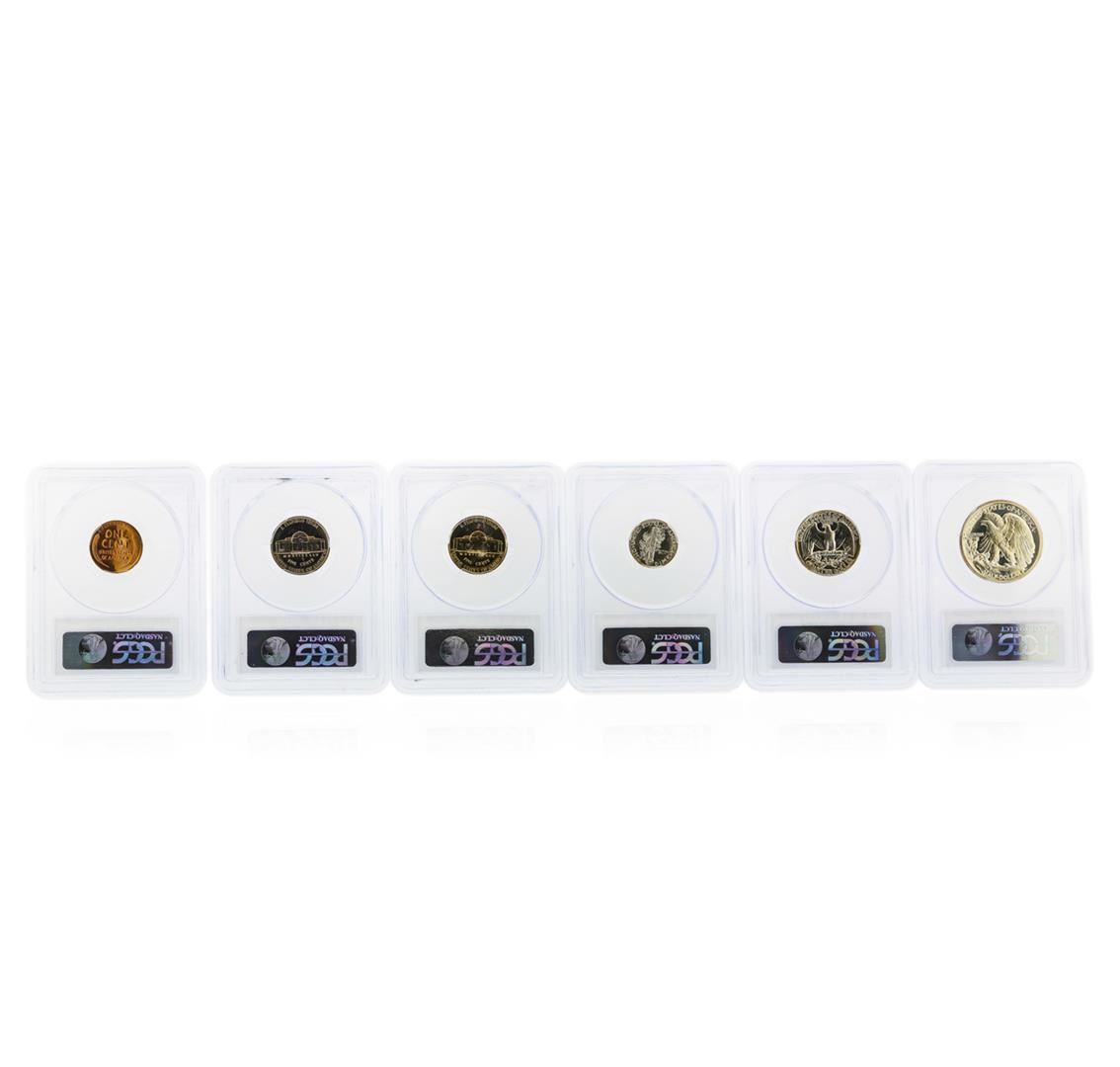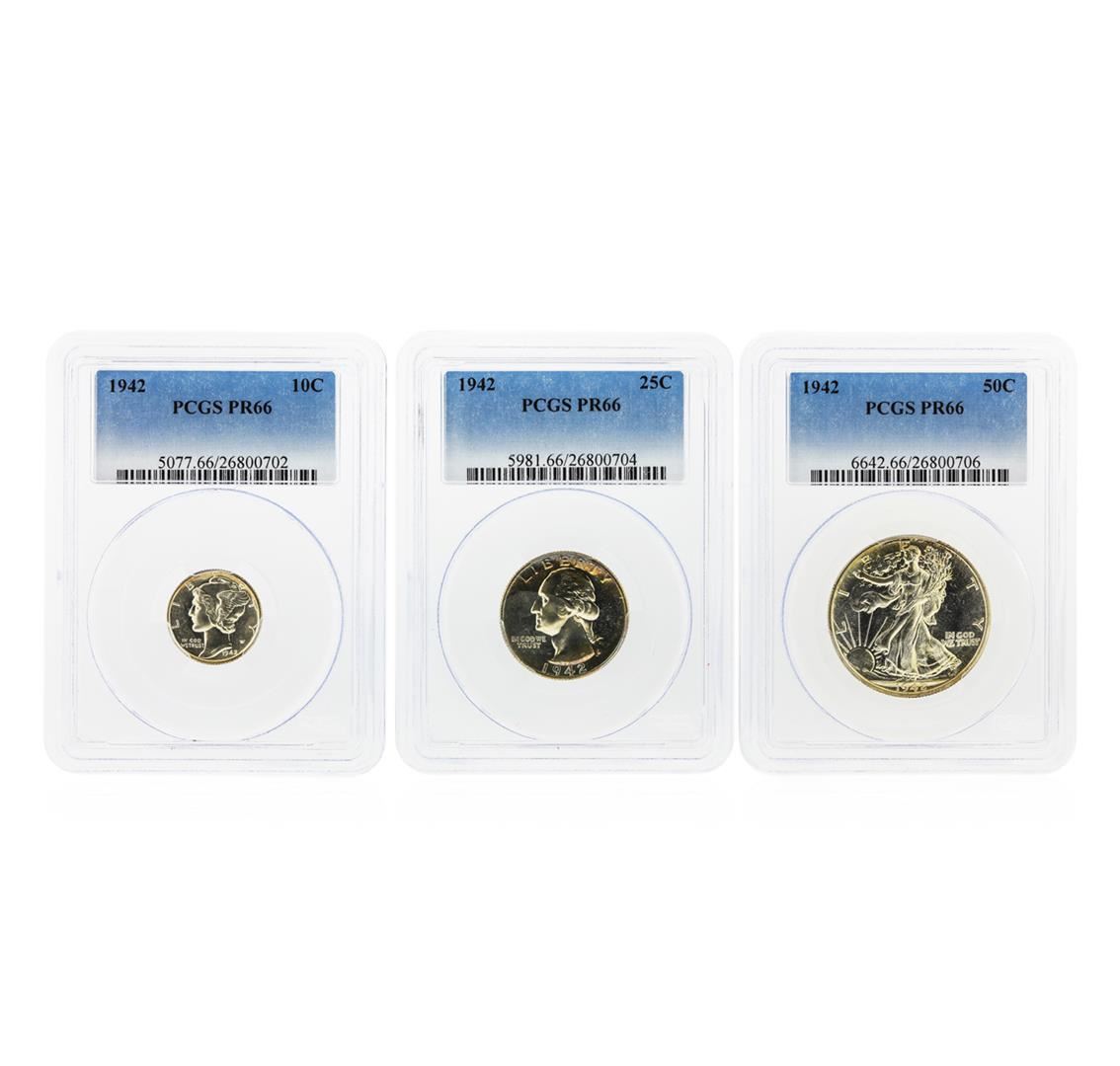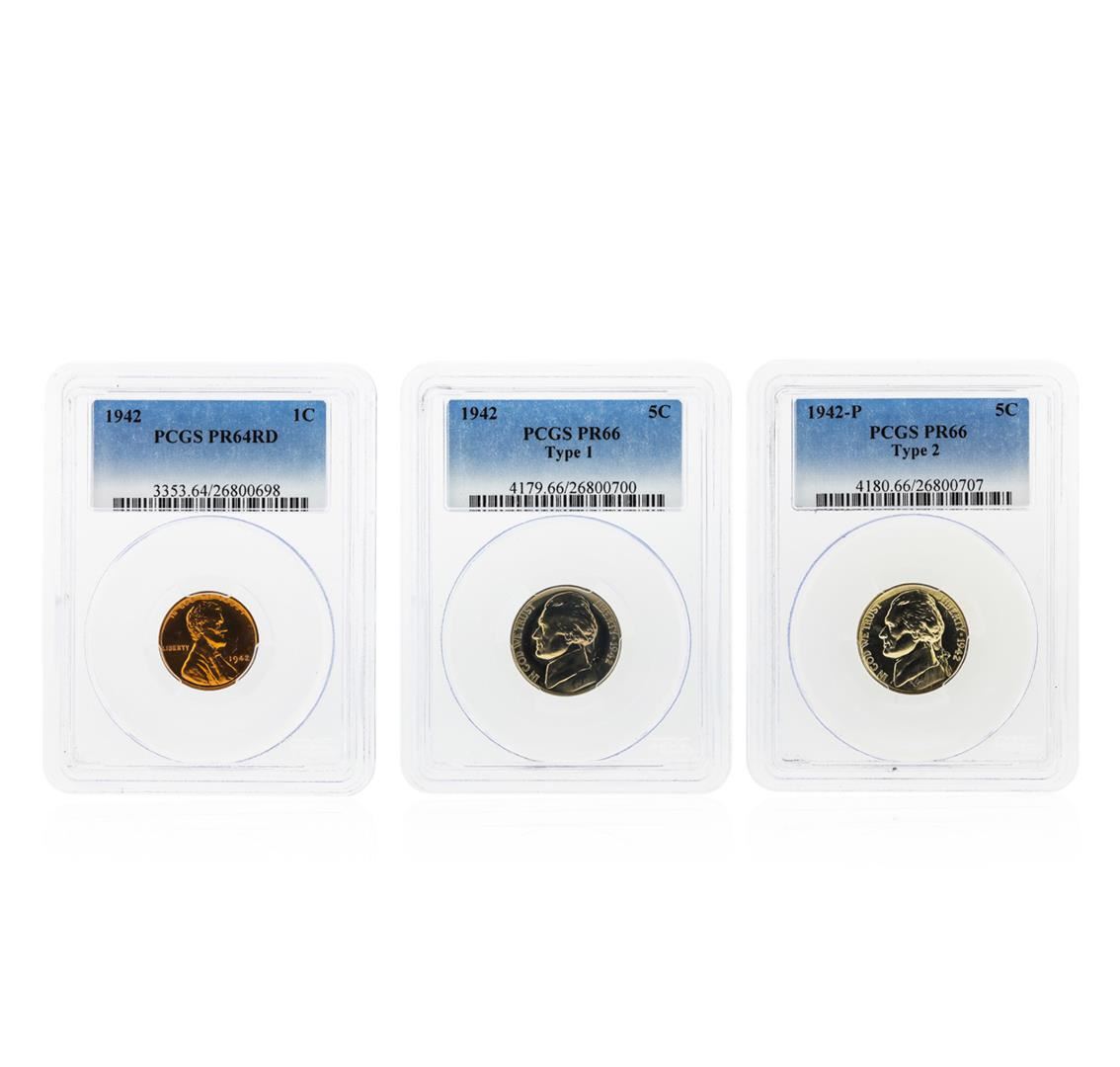 This 1942 PCGS Graded (6) Coin Proof Set includes the following coins: 1942 Lincoln Cent PCGS Graded PR64RD coin, 1942 Jefferson Nickel PCGS Graded PR66 Type 1, 1942-P Jefferson Nickel PCGS Graded PR66 Type 2, 1942 Mercury Dime PCGS Graded PR66, 1942 Wash PCGS Graded.
