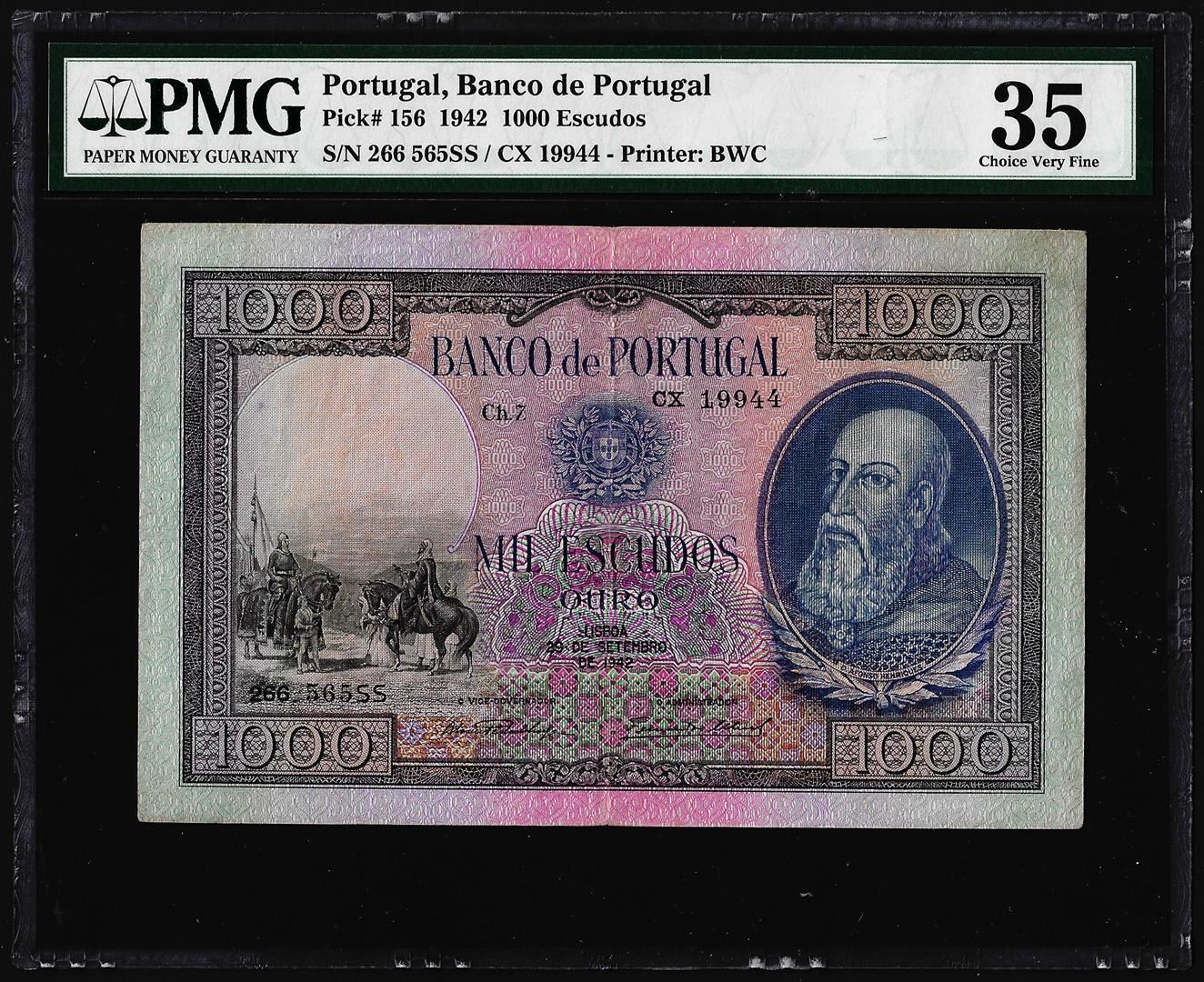 One 1942 Portugal Banco de Portugal 1000 Escudos Note Pick# 156 PMG Choice Very Fine 35. PMG Certified.