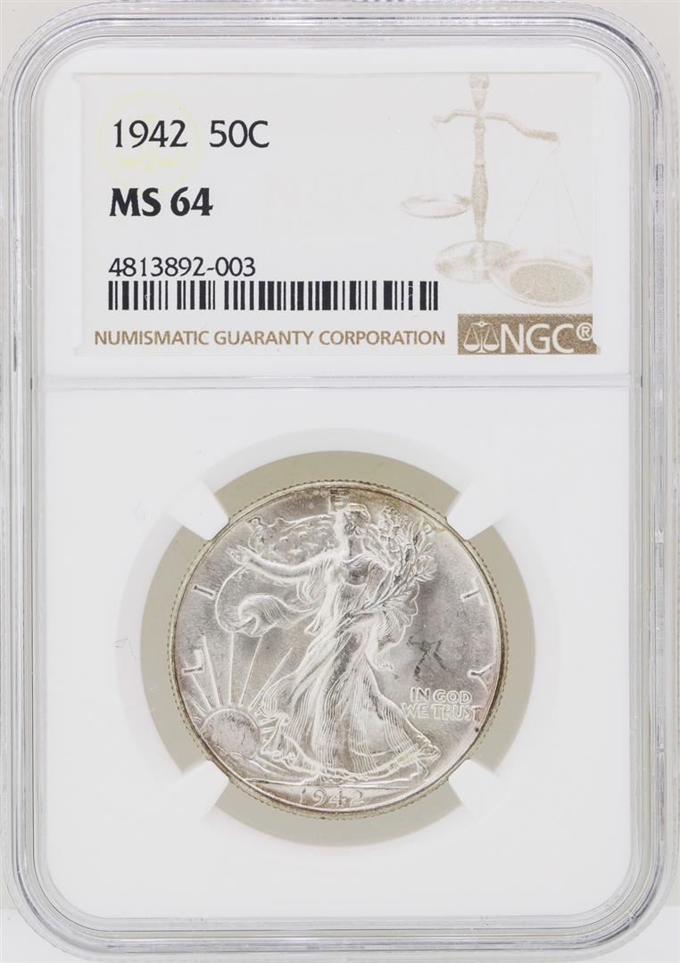 One 1942 Walking Liberty Half Dollar Coin NGC MS64. NGC Certified.