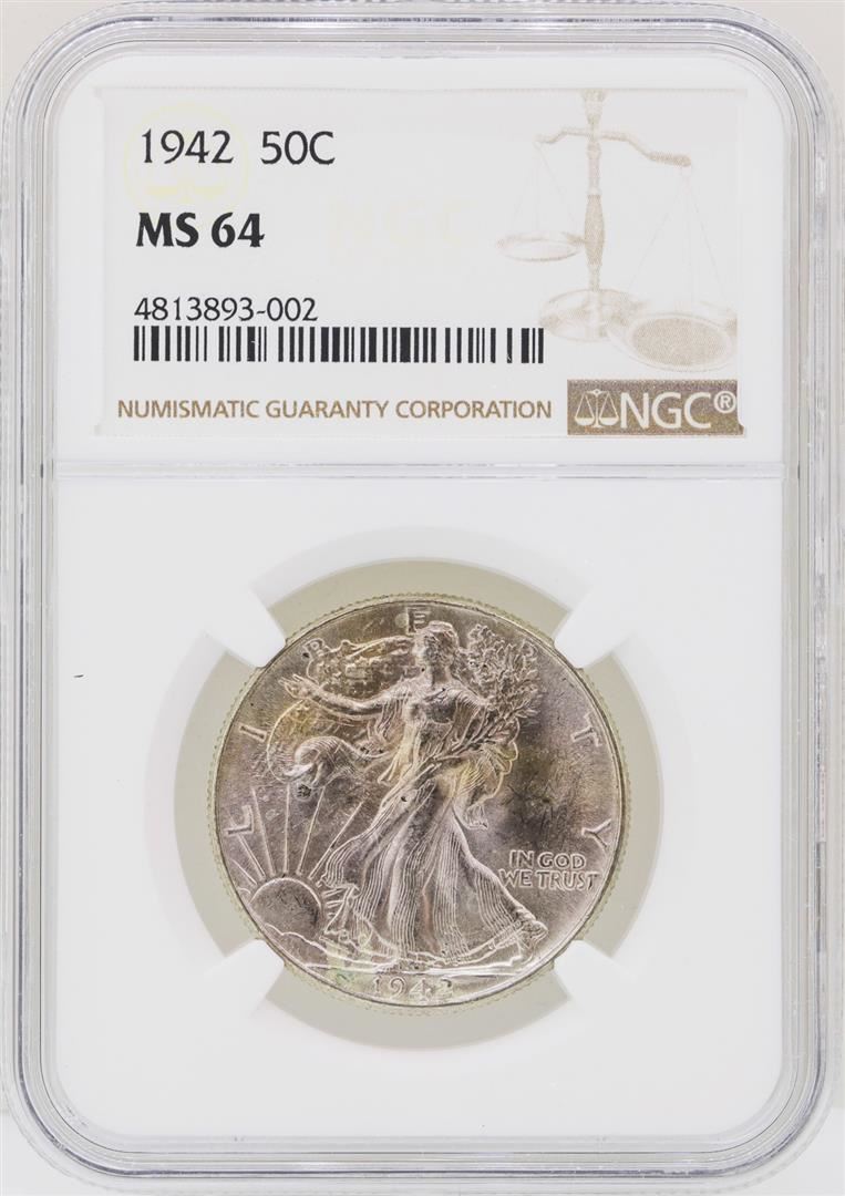 One 1942 Walking Liberty Half Dollar Coin NGC MS64. NGC Certified.