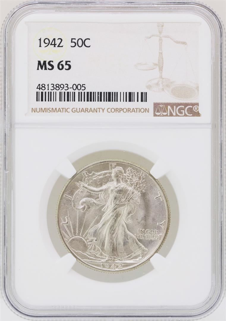 One 1942 Walking Liberty Half Dollar Coin NGC MS65. NGC Certified.