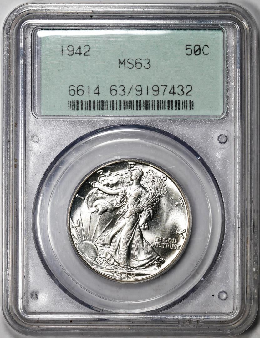 1942 Walking Liberty Half Dollar Coin PCGS MS63 Old Green Biscuit Holder