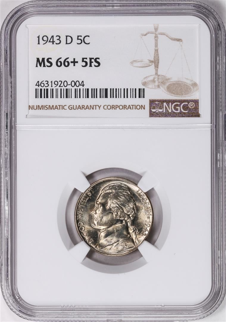 One 1943-D Jefferson Nickel Coin NGC MS66+ 5FS. NGC Certified.