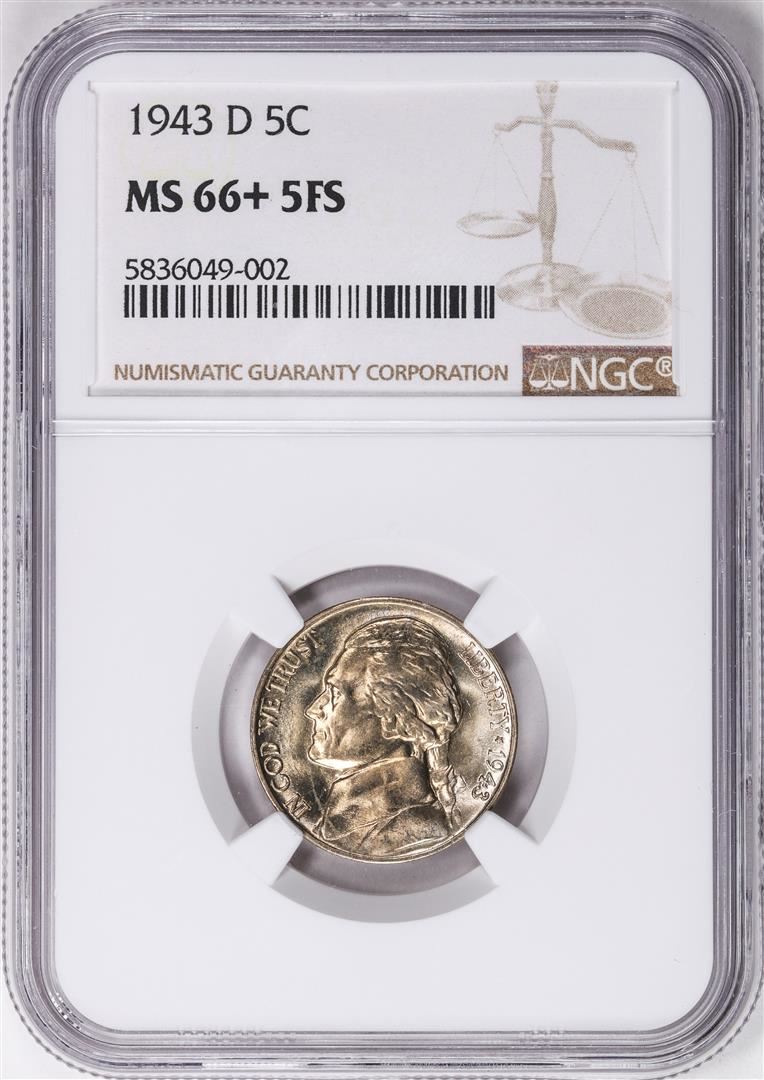 One 1943-D Jefferson Nickel Coin NGC MS66+ 5FS. NGC Certified.