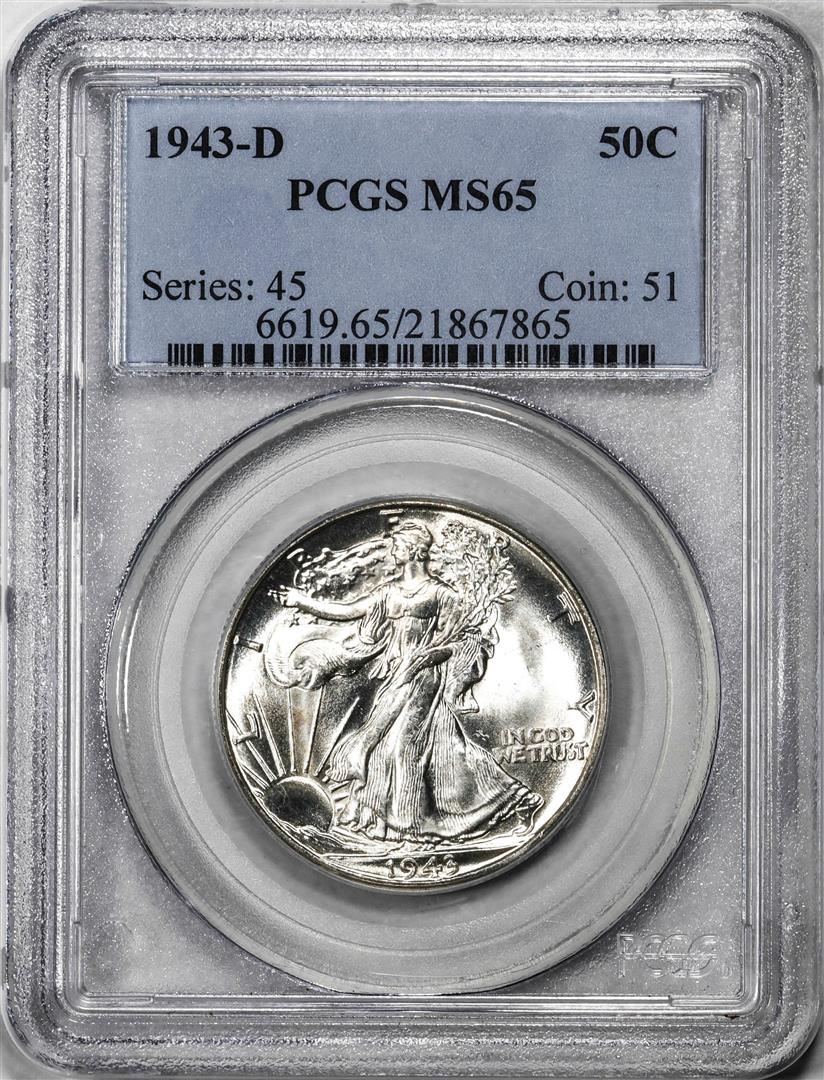 One 1943-D Walking Liberty Half Dollar Coin PCGS MS65. PCGS Graded.