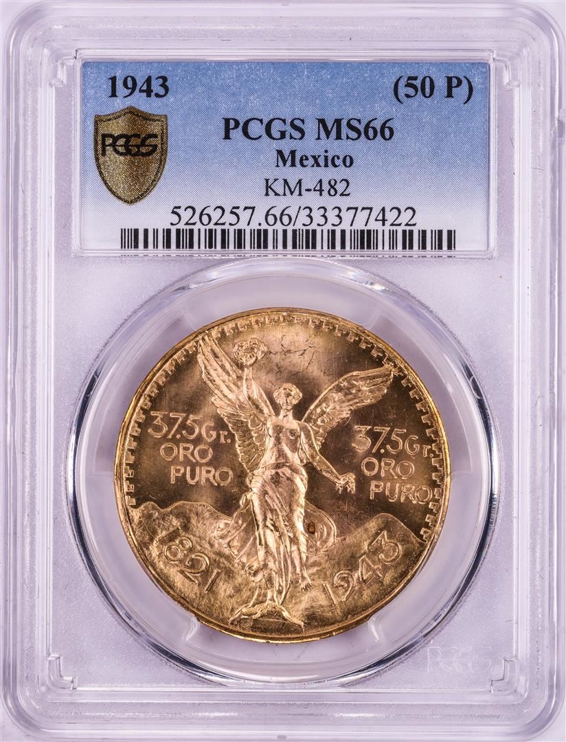 One 1943 Mexico 50 Pesos Gold Coin PCGS MS66. PCGS Graded.
