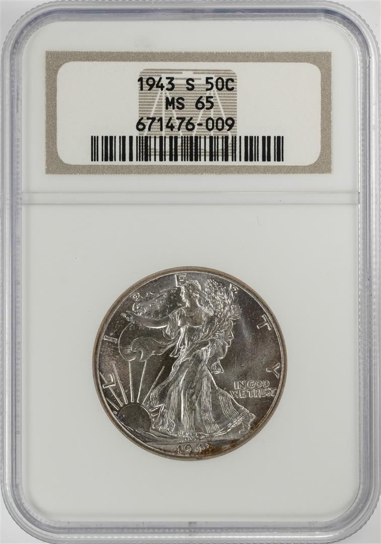 One 1943-S Walking Liberty Half Dollar Coin NGC MS65. NGC Certified.