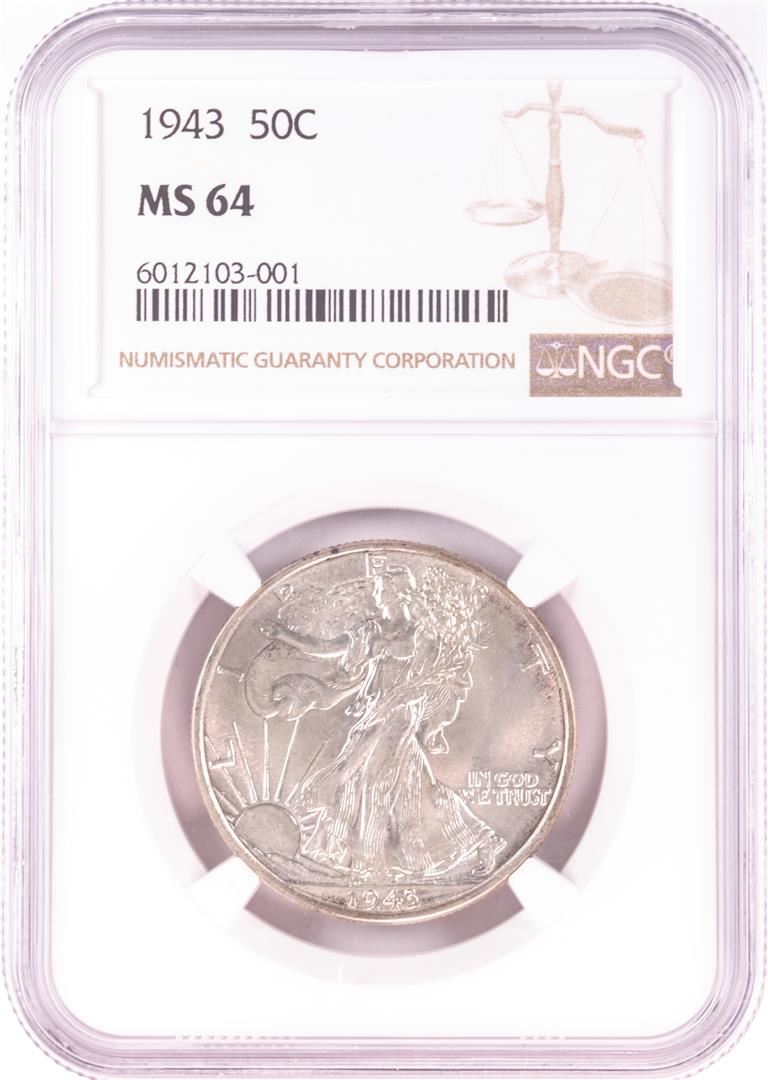 One 1943 Walking Liberty Half Dollar Coin NGC MS64. NGC Certified.