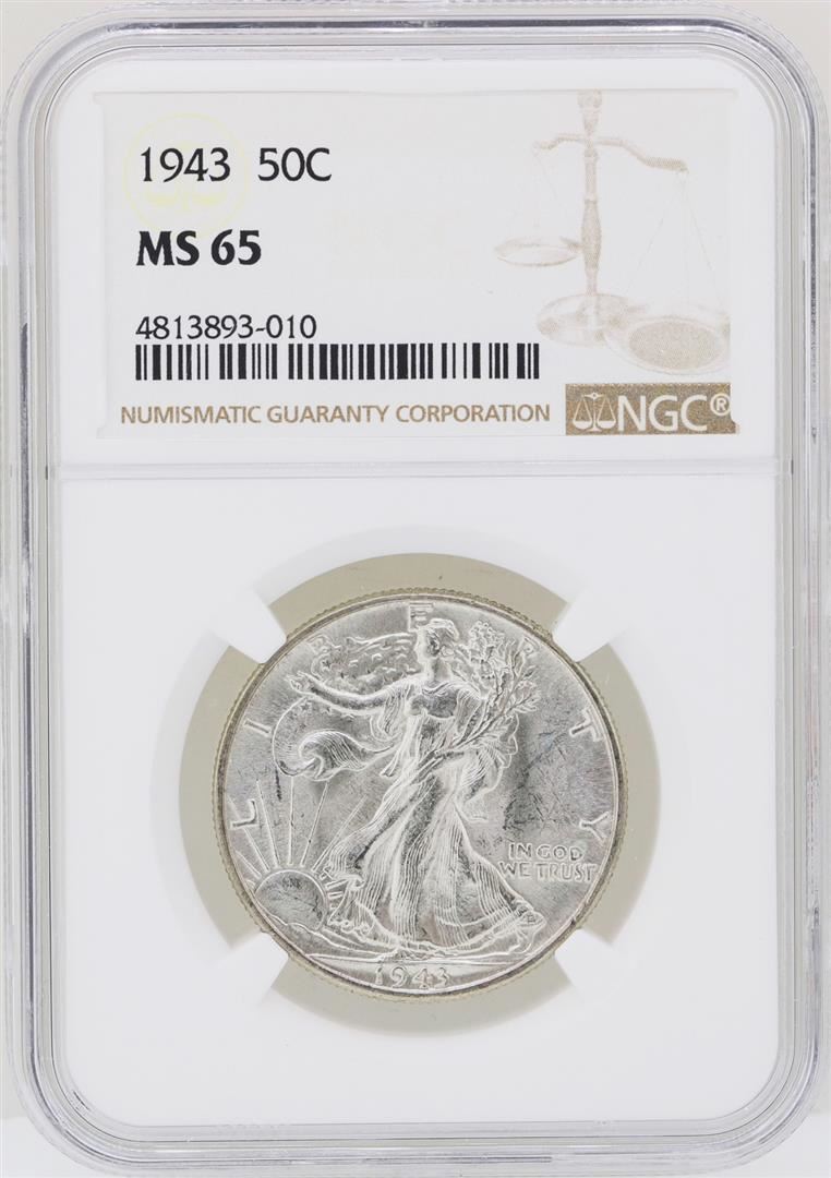 One 1943 Walking Liberty Half Dollar Coin NGC MS65. NGC Certified.