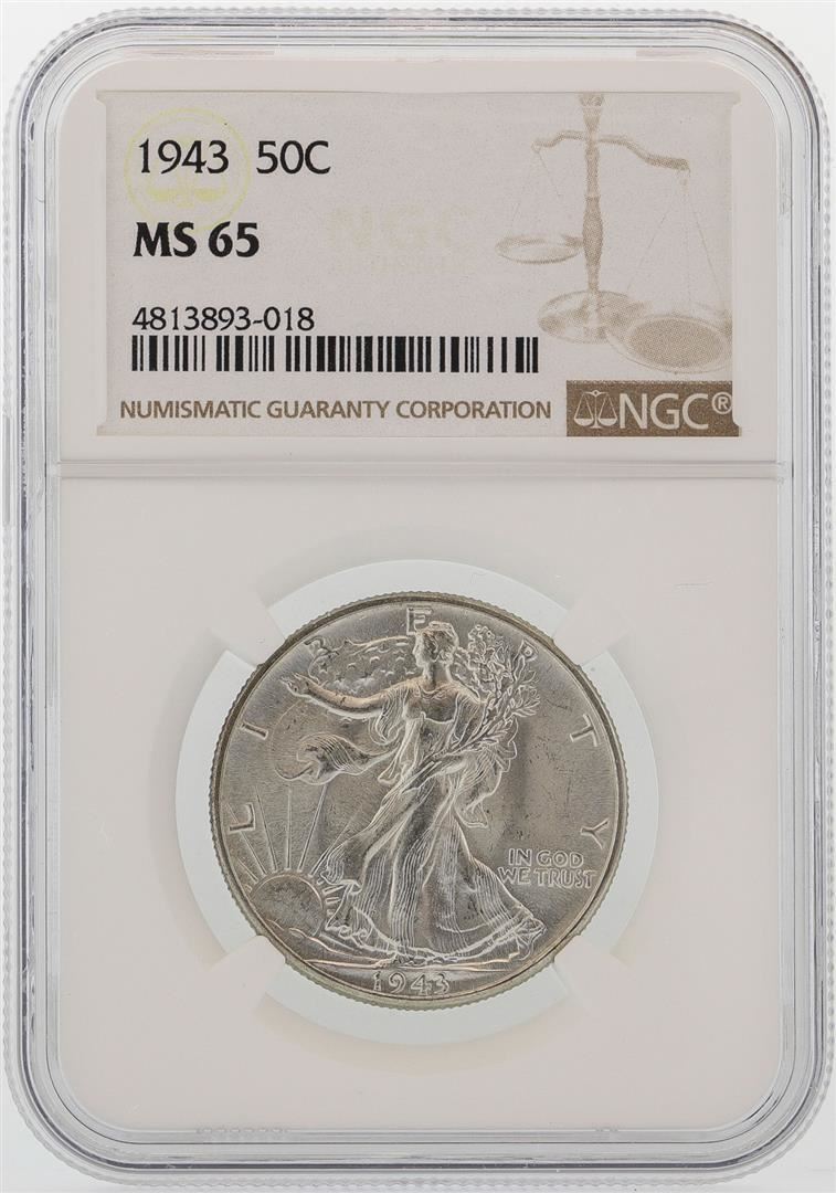 One 1943 Walking Liberty Half Dollar Coin NGC MS65. NGC Certified.