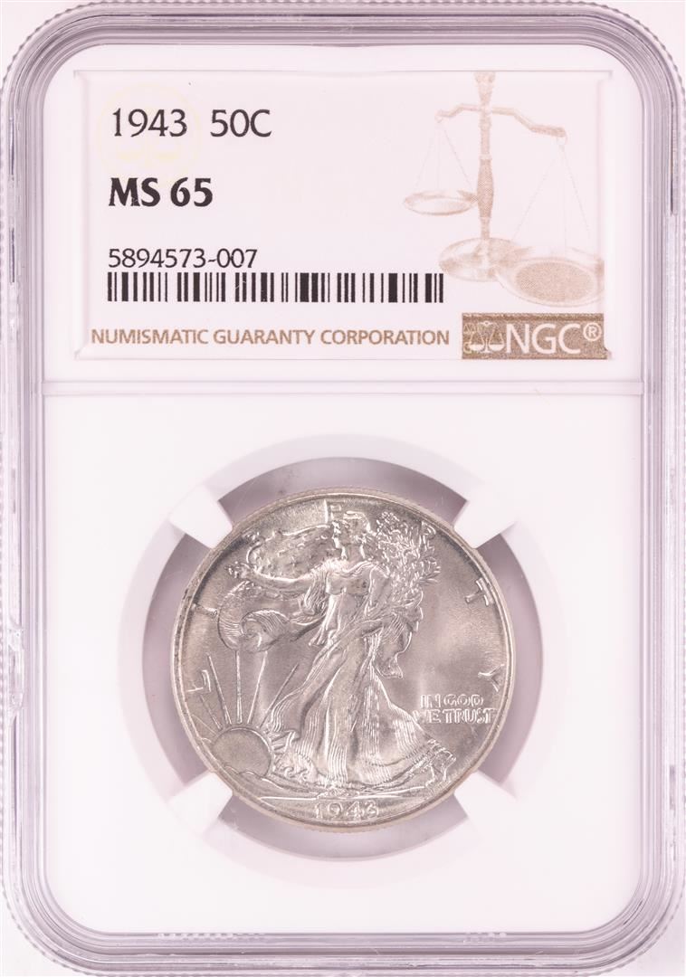 One 1943 Walking Liberty Half Dollar Coin NGC MS65. NGC Certified.