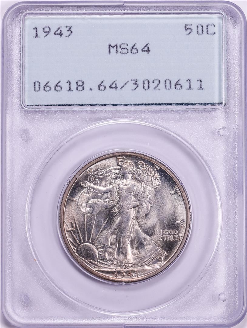 1943 Walking Liberty Half Dollar Coin PCGS MS64 Green Rattler Holder