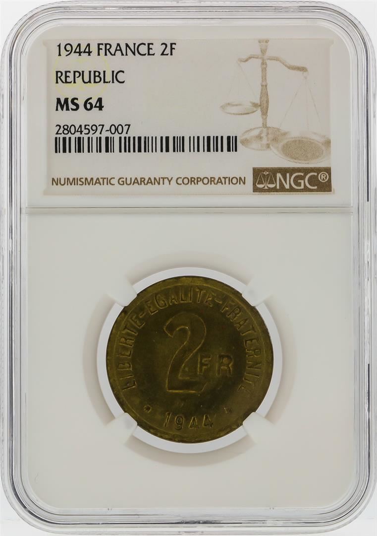One 1944 2 Franc WWII Allied Occupied France Coin NGC MS64. NGC Certified.