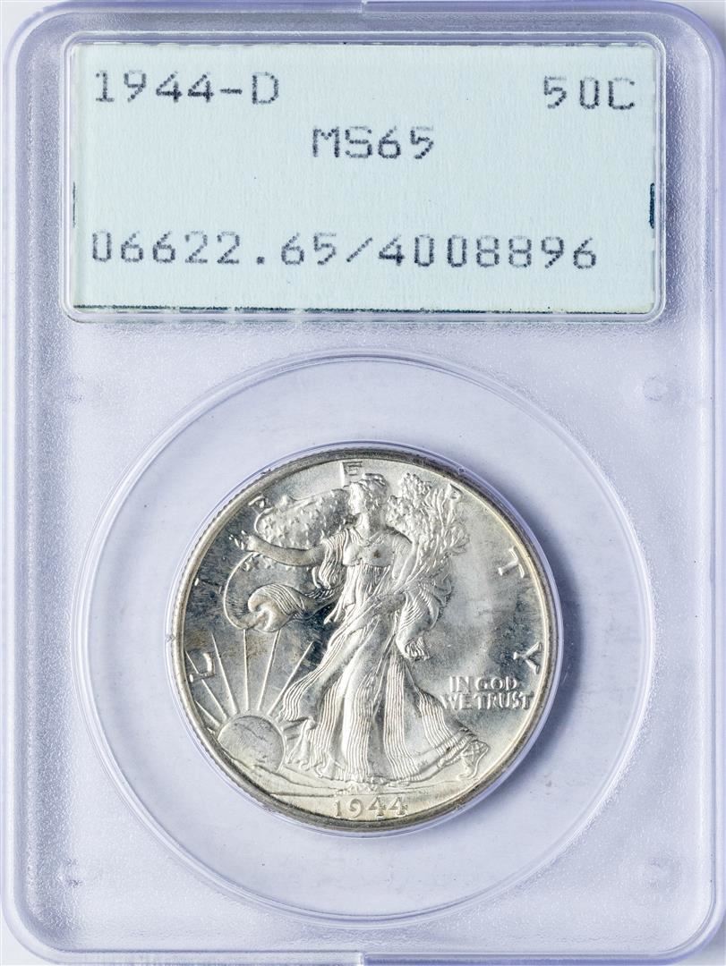 One 1944-D Walking Liberty Half Dollar Coin PCGS MS65 Old Green Rattler. PCGS Graded.