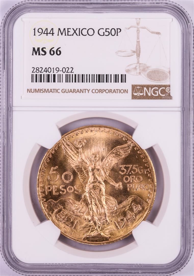 One 1944 Mexico 50 Pesos Gold Coin NGC MS66. NGC Certified.