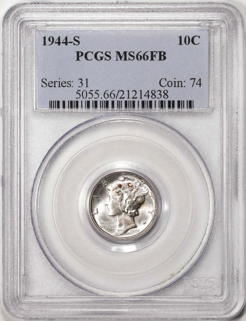 One 1944-S Mercury Dime Coin PCGS MS66FB. PCGS Graded.