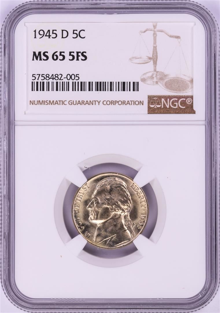 One 1945-D Jefferson Nickel Coin NGC MS65 5FS. NGC Certified.