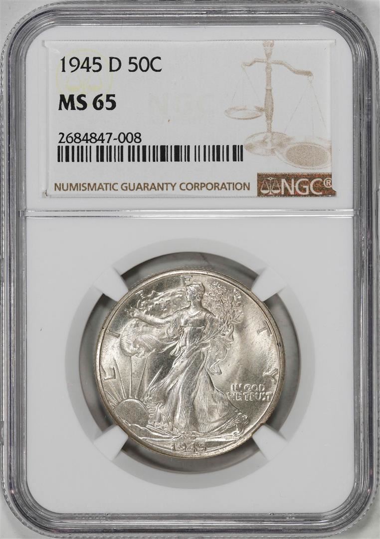 One 1945-D Walking Liberty Half Dollar Coin NGC MS65. NGC Certified.