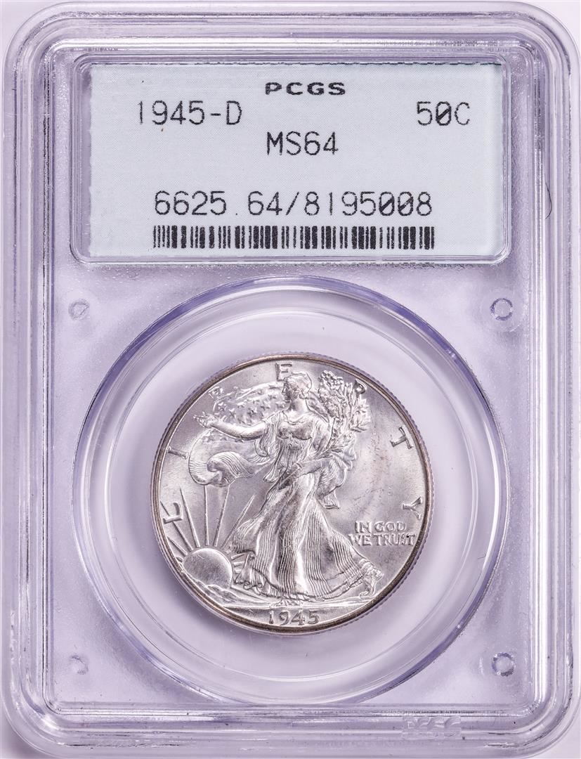 One 1945-D Walking Liberty Half Dollar Coin PCGS MS64 Old Green Holder. PCGS Graded.