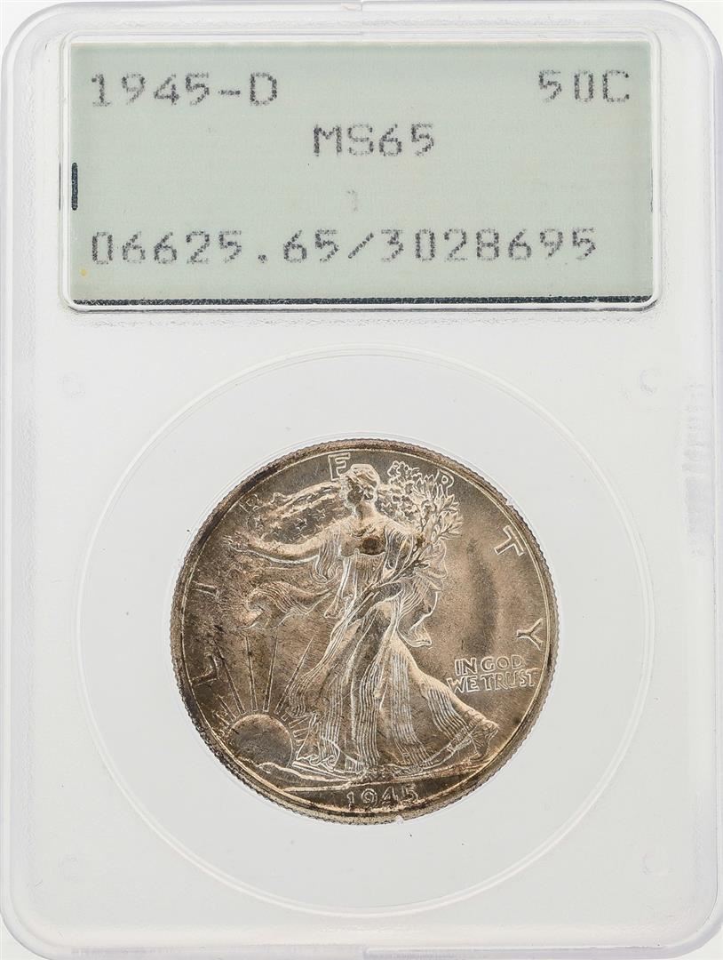 One 1945-D Walking Liberty Half Dollar Coin PCGS MS65 Old Green Rattler. PCGS Graded.