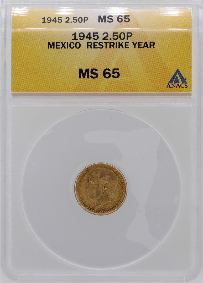 One 1945 Mexico 2 1/2 Pesos Gold Coin ANACS MS65. ANACS Certified.