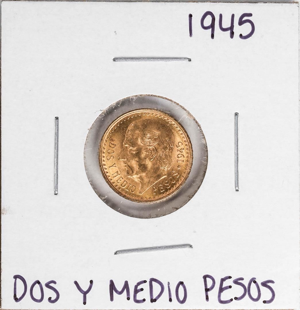 One 1945 Mexico Dos Y Medio Pesos Gold Coin.