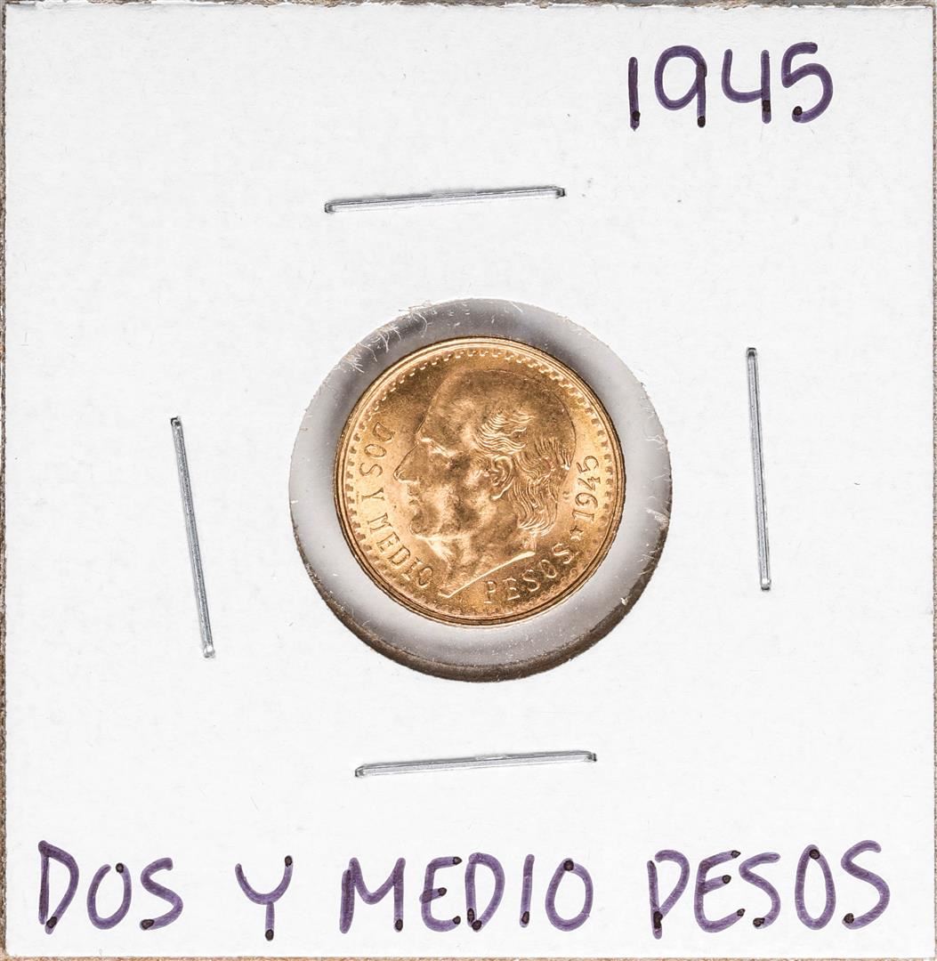 One 1945 Mexico Dos Y Medio Pesos Gold Coin.