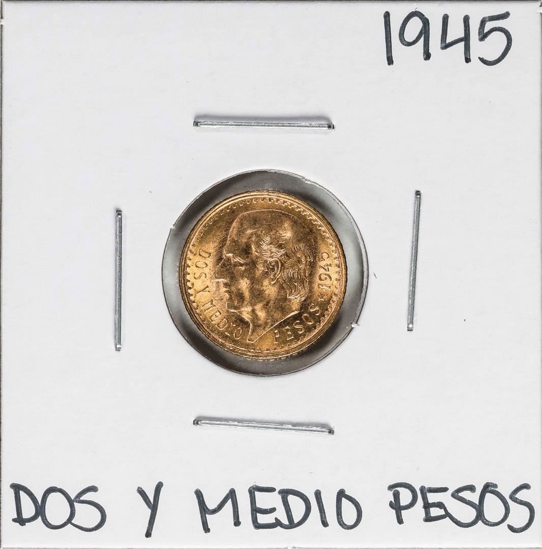One 1945 Mexico Dos Y Medio Pesos Gold Coin.