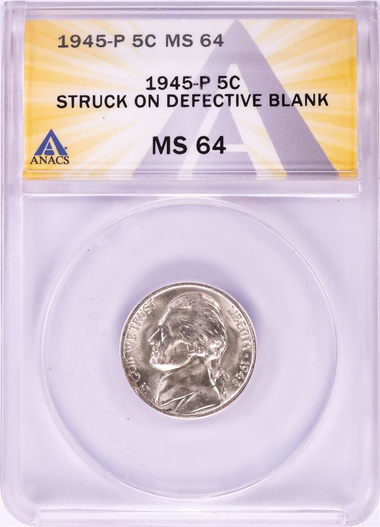 One 1945-P Jefferson Nickel Coin Struck on Defective Blank ANACS MS64. ANACS Certified.