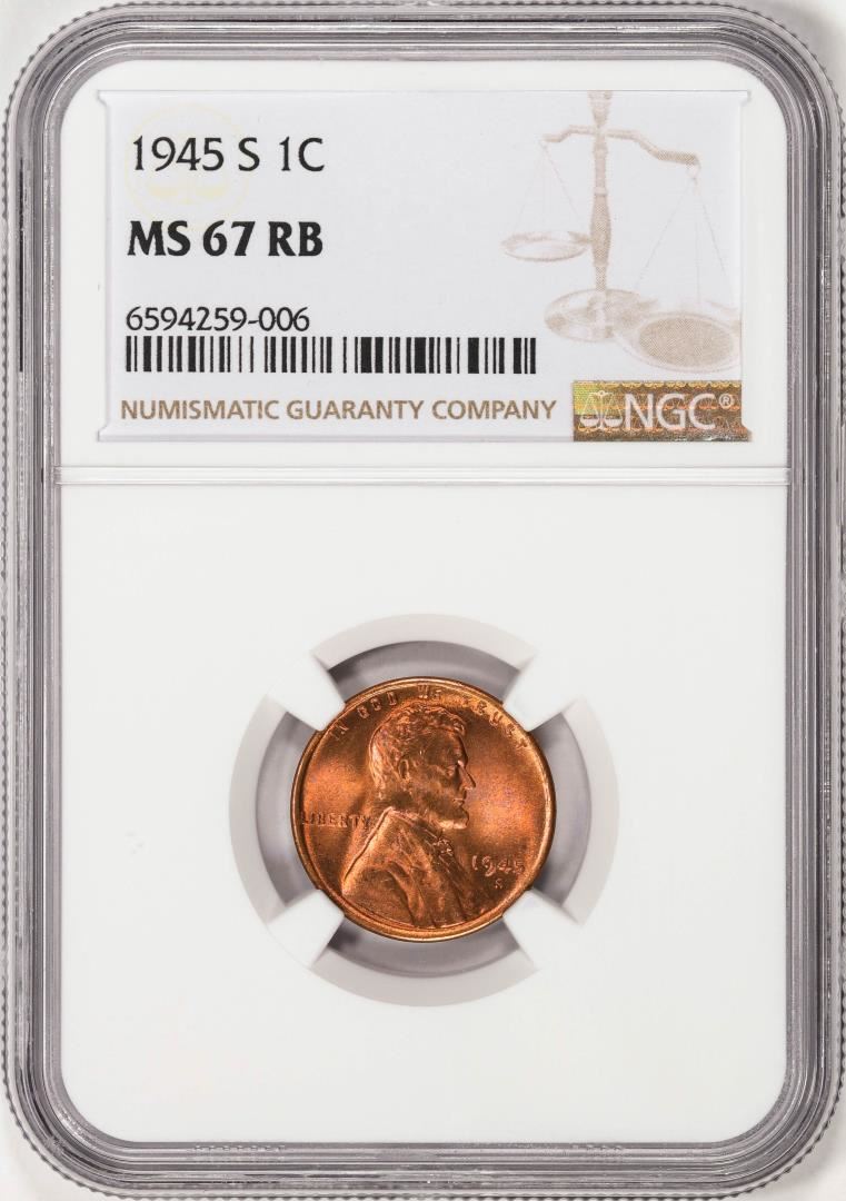 One 1945-S Lincoln Wheat Cent Coin NGC MS67RB. NGC Certified.