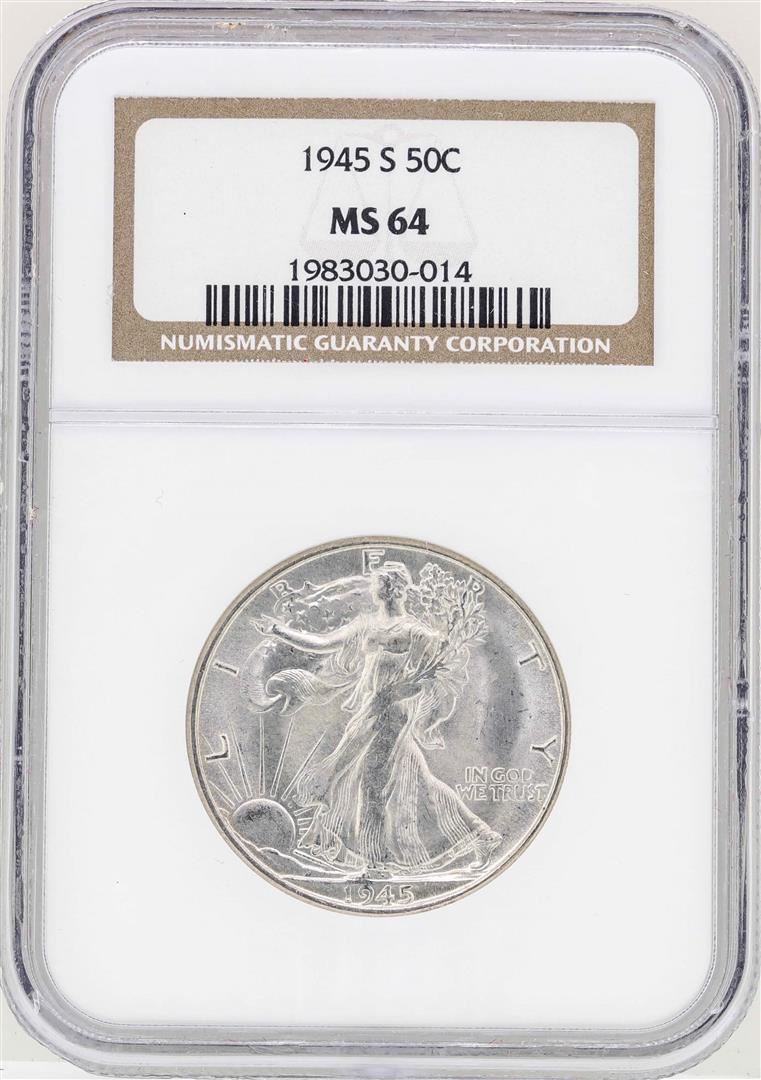 One 1945-S Walking Liberty Half Dollar Coin NGC MS64. NGC Certified.