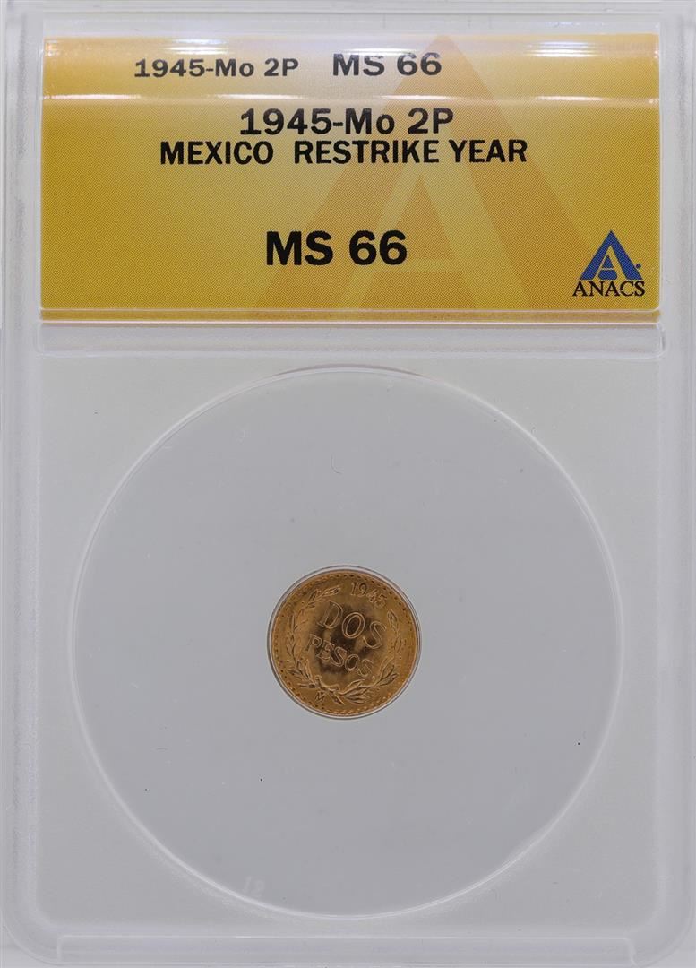 One 1945MO Mexico 2 Pesos Gold Coin ANACS MS66. ANACS Certified.