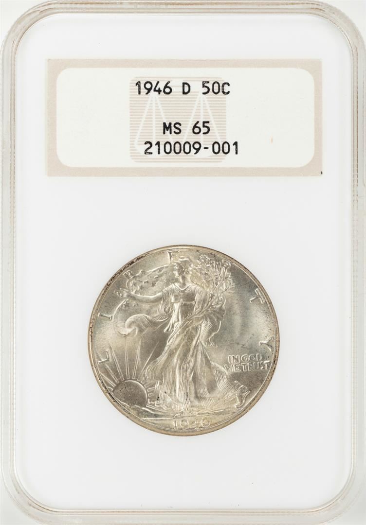 One 1946-D Walking Liberty Half Dollar Coin NGC MS65. NGC Certified.