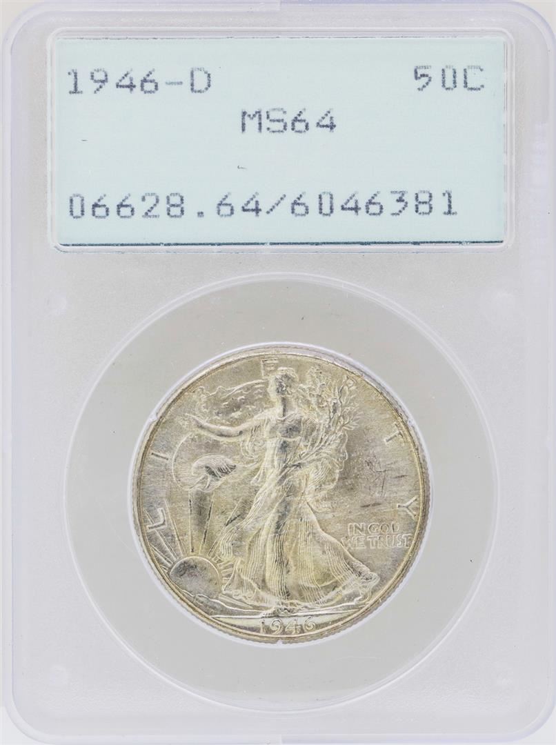 1946-D Walking Liberty Half Dollar Coin PCGS MS64 Green Rattler Holder