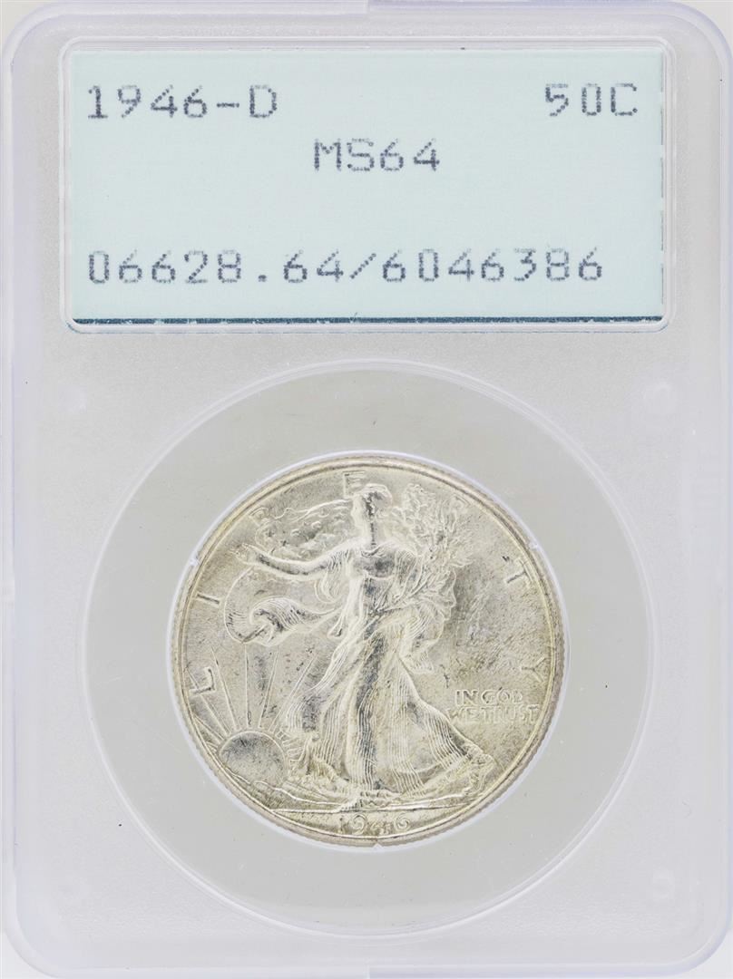 One 1946-D Walking Liberty Half Dollar Coin PCGS MS64 Green Rattler Holder. PCGS Graded.