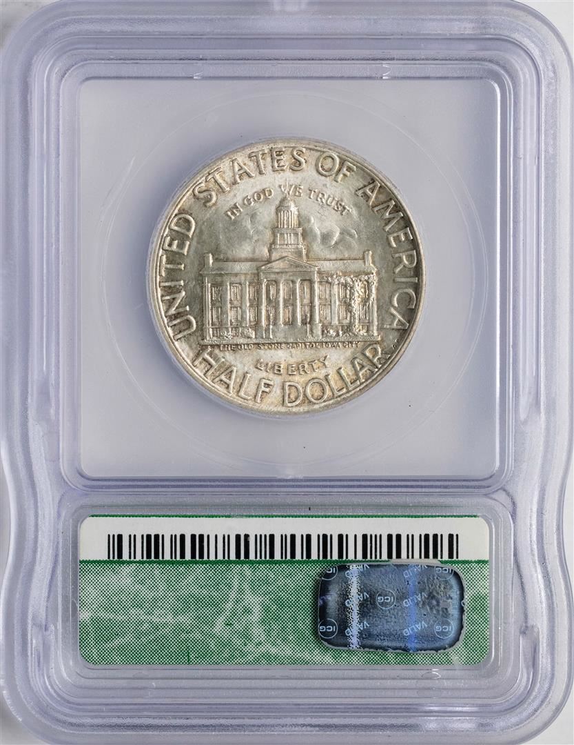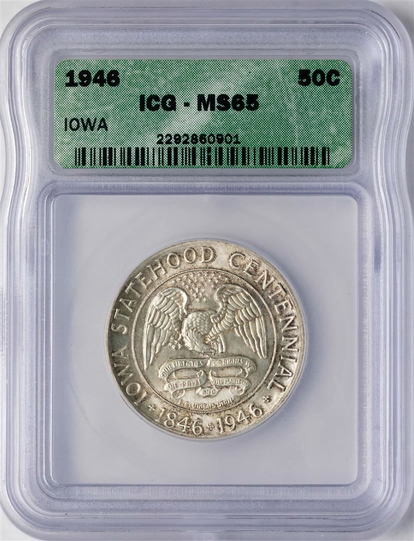 One 1946 Iowa Centennial Commemorative Half Dollar Coin ICG MS65. ICG Certified.