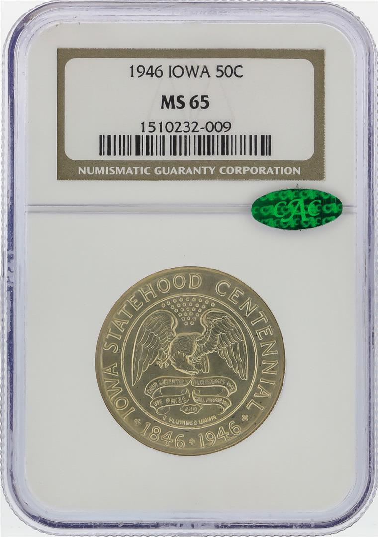 One 1946 Iowa Centennial Commemorative Half Dollar Coin NGC MS65. NGC Certified.