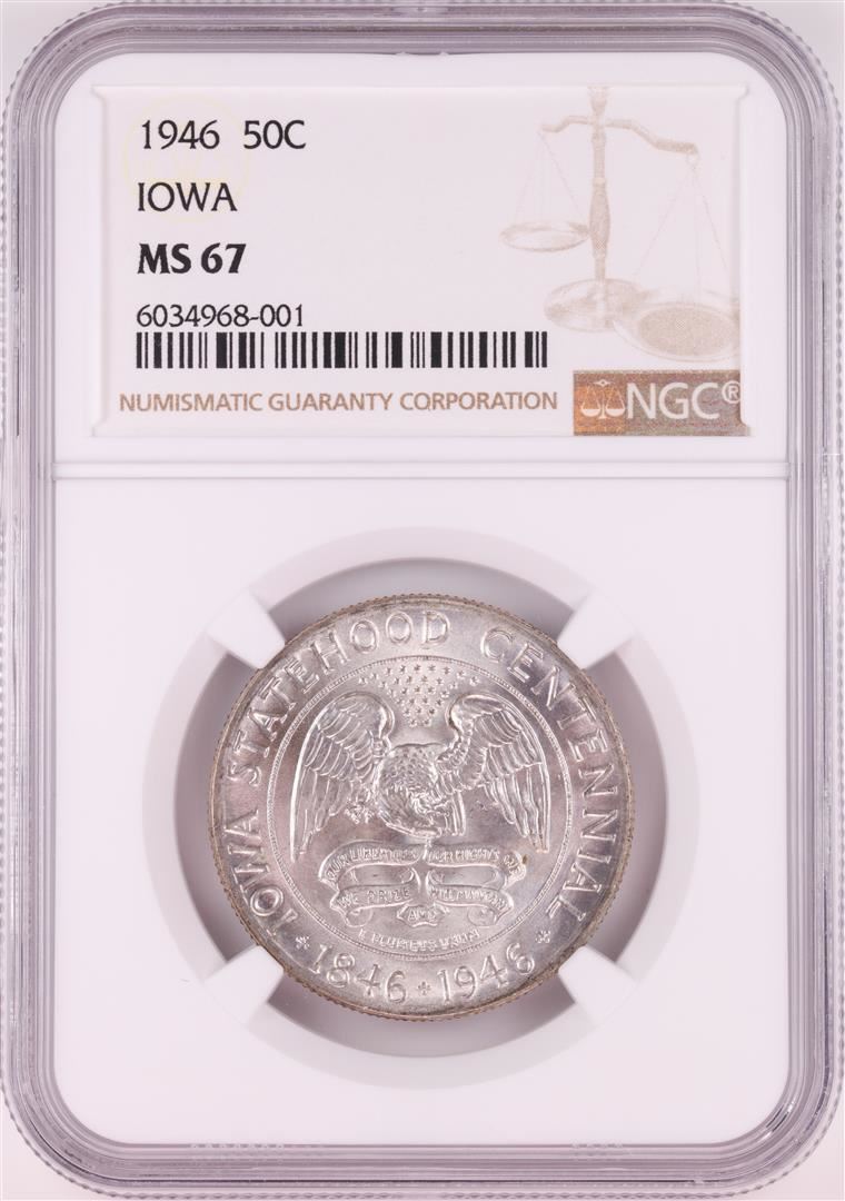 One 1946 Iowa Centennial Commemorative Half Dollar Coin NGC MS67. NGC Certified.