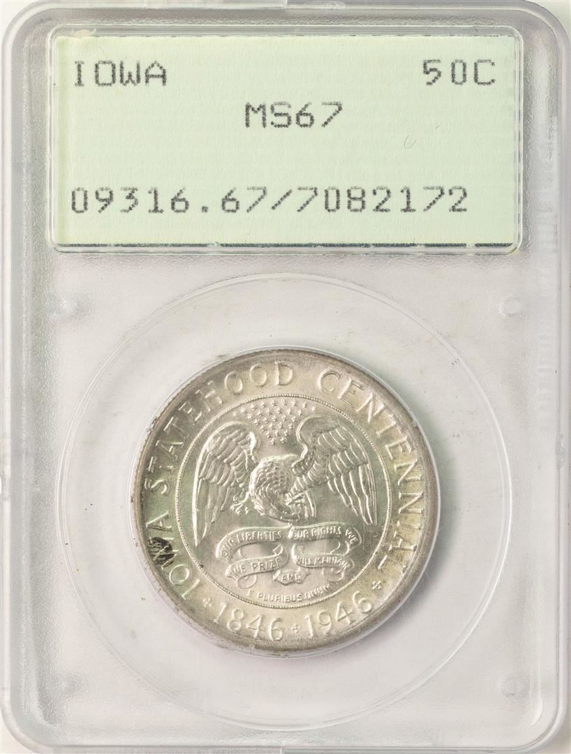 One 1946 Iowa Centennial Commemorative Half Dollar Coin PCGS MS67 Old Rattler Holder. PCGS Graded.