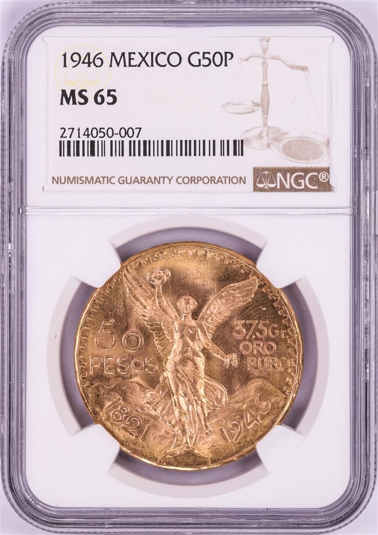 One 1946 Mexico 50 Pesos Gold Coin NGC MS65. NGC Certified.