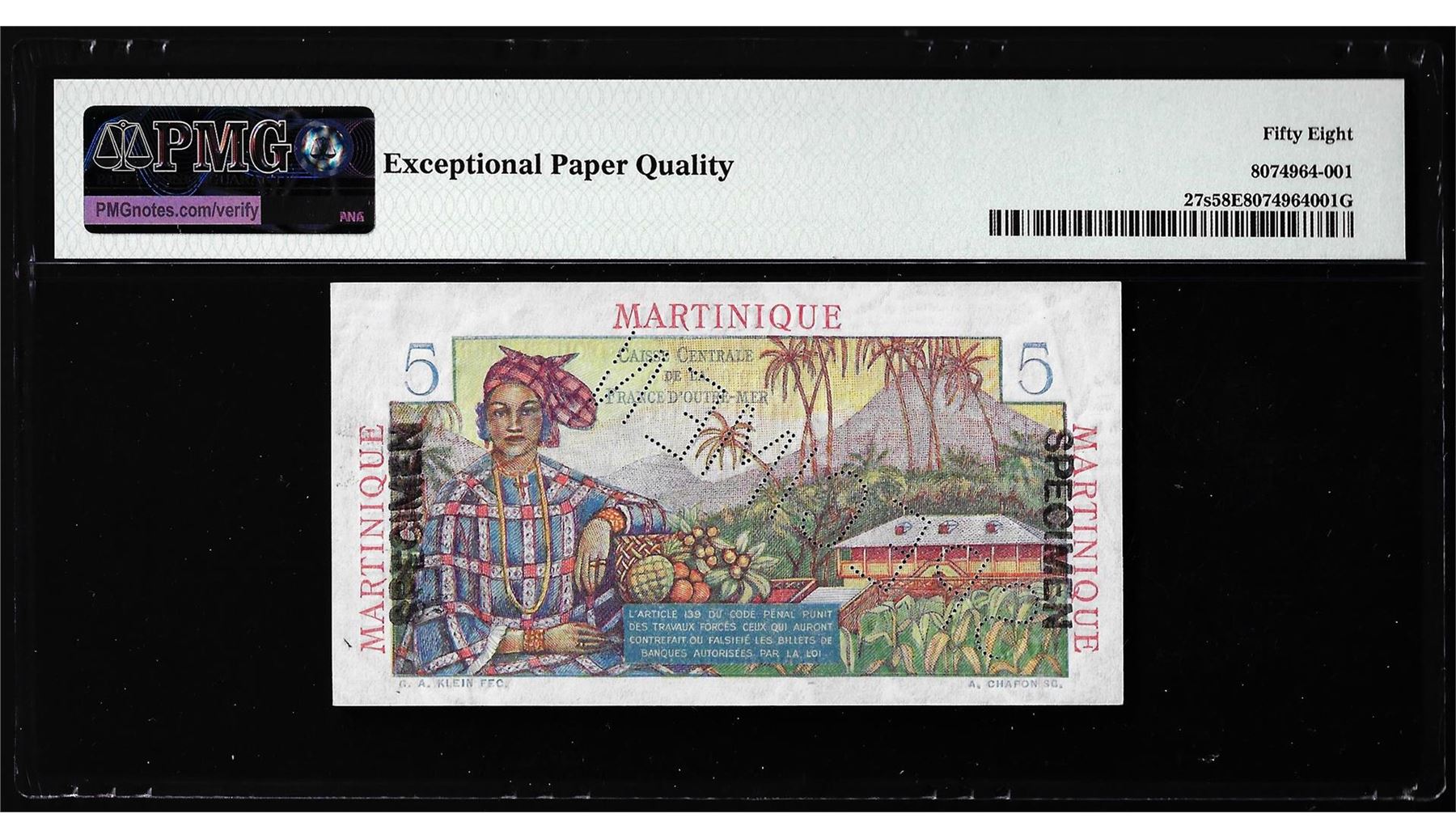 One 1947-1949 Martinique Caisse Centrale 5 Francs Note Pick# 27s PMG Choice About UNC 58EPQ. PMG Certified.