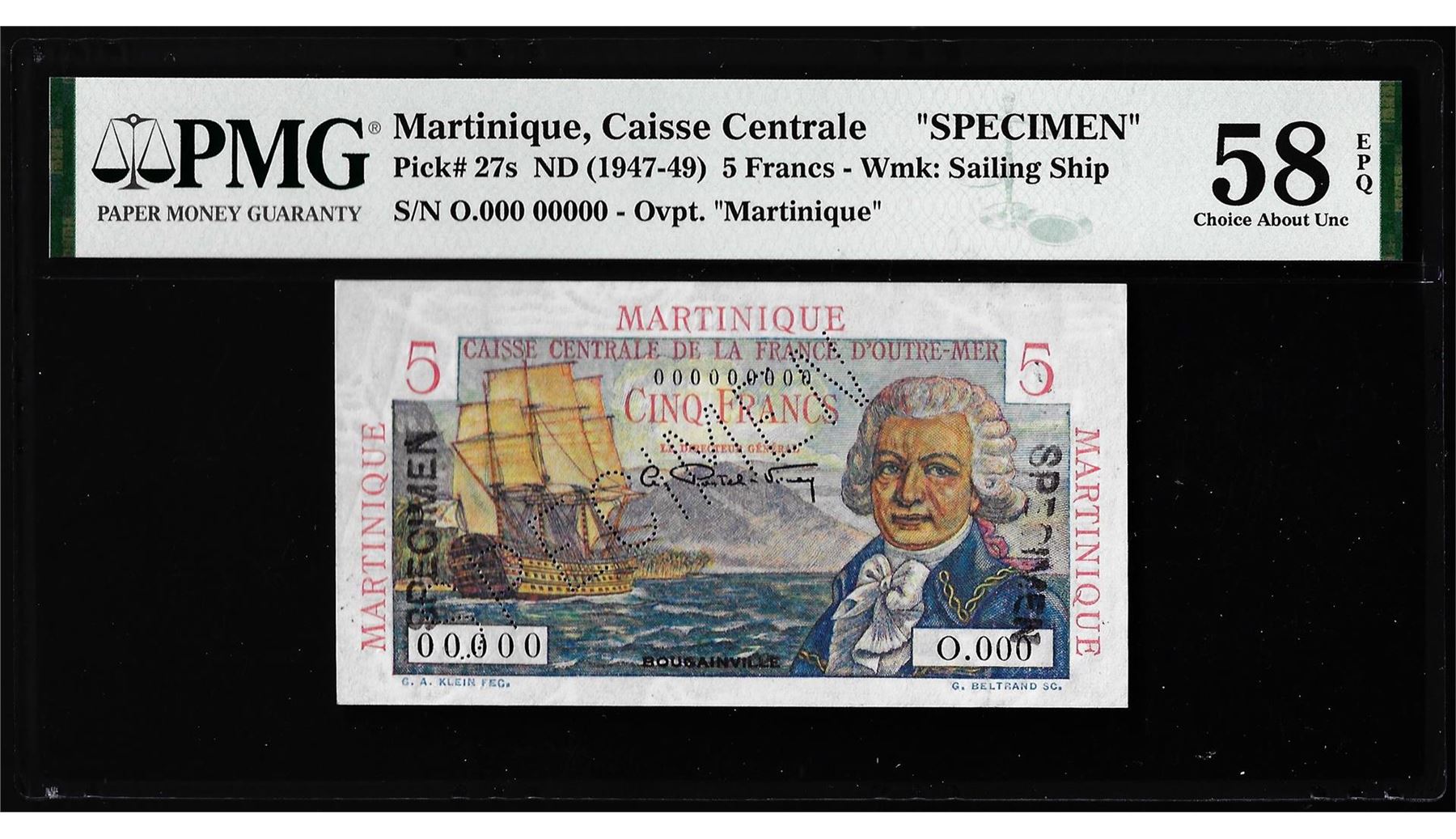 One 1947-1949 Martinique Caisse Centrale 5 Francs Note Pick# 27s PMG Choice About UNC 58EPQ. PMG Certified.