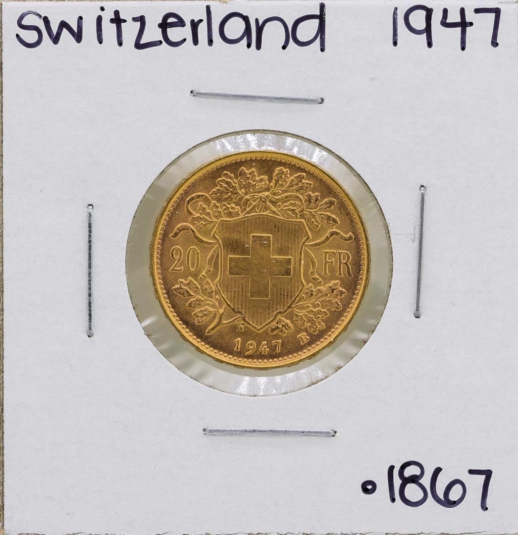 One 1947-B Switzerland 20 Francs Gold Coin.