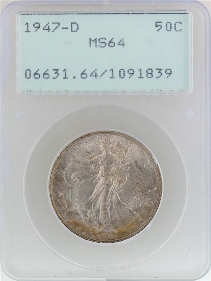 One 1947-D Walking Liberty Half Dollar Coin PCGS MS64 Old Green Rattler. PCGS Graded.