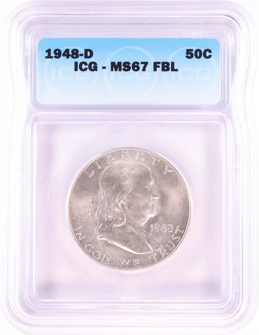 One 1948-D Franklin Half Dollar Coin ICG MS67FBL. ICG Certified.