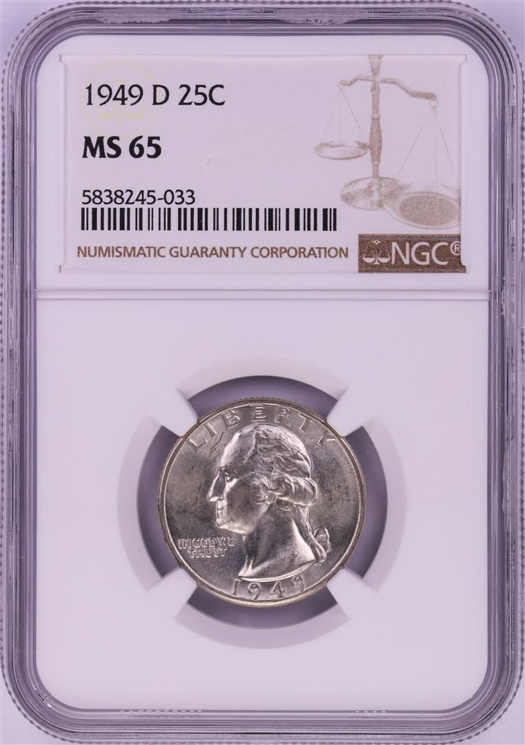 One 1949-D Washington Quarter Coin NGC MS65. NGC Certified.