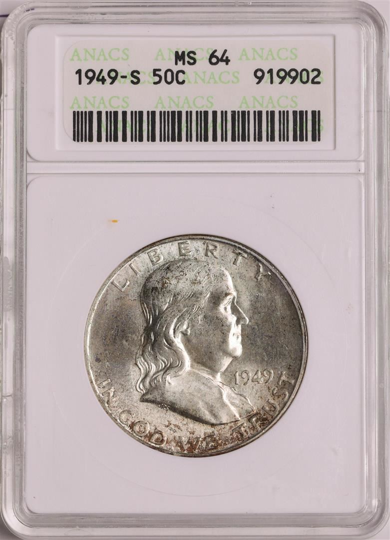 One 1949-S Franklin Half Dollar Coin ANACS MS64. ANACS Certified.