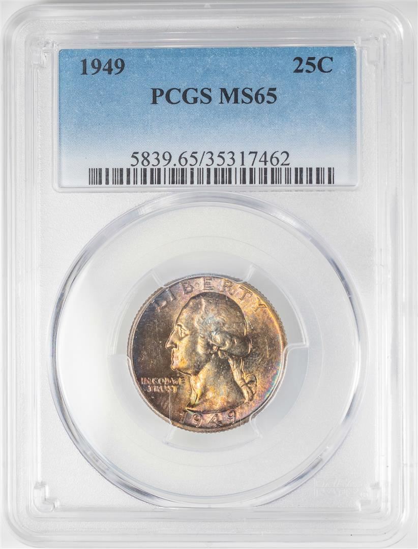 One 1949 Washington Quarter Coin PCGS MS65 Amazing Toning. PCGS Graded.
