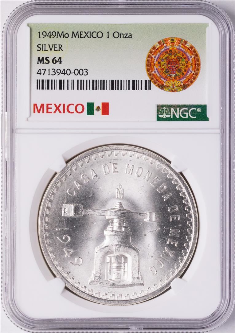 One 1949Mo Mexico 1 Onza Silver Coin NGC MS64. NGC Certified.