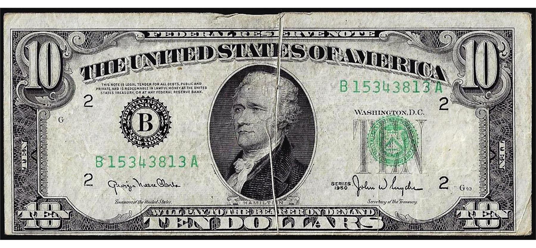 One 1950 $10 Federal Reserve Note ERROR Double Gutter Fold.